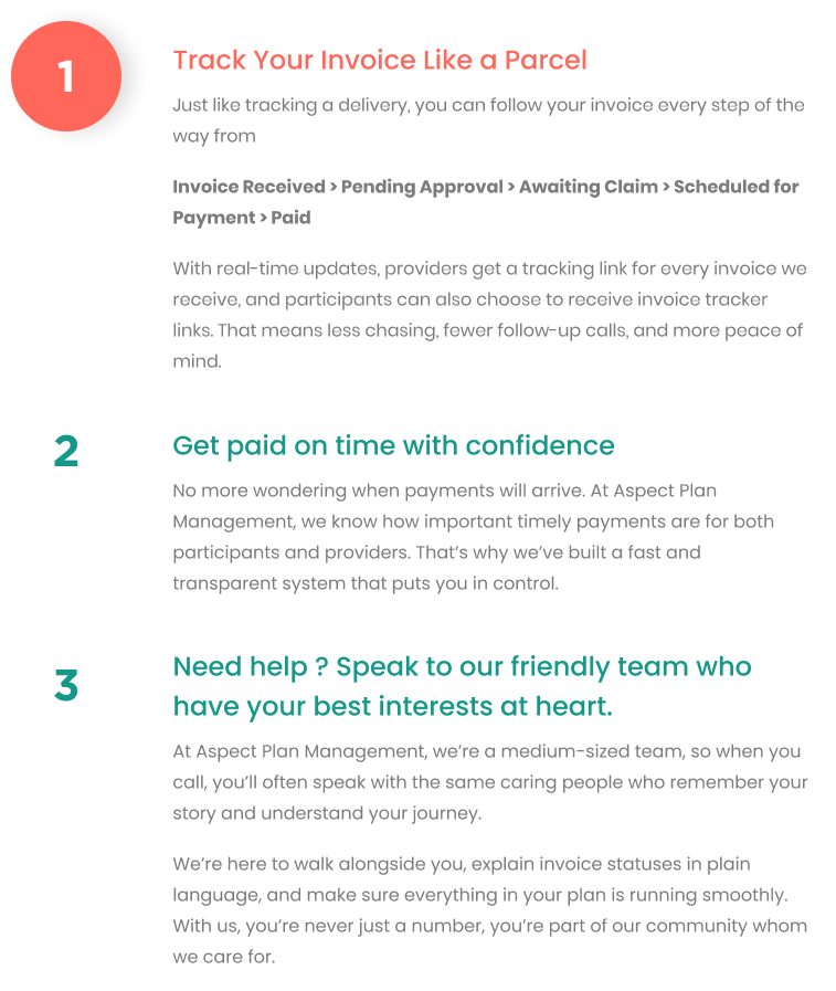 At Aspect Plan Management, we make tracking your NDIS invoices simple, fast, and stress-free. With our real-time invoice tracking system, you’ll always know where your payments stand just like tracking a parcel.